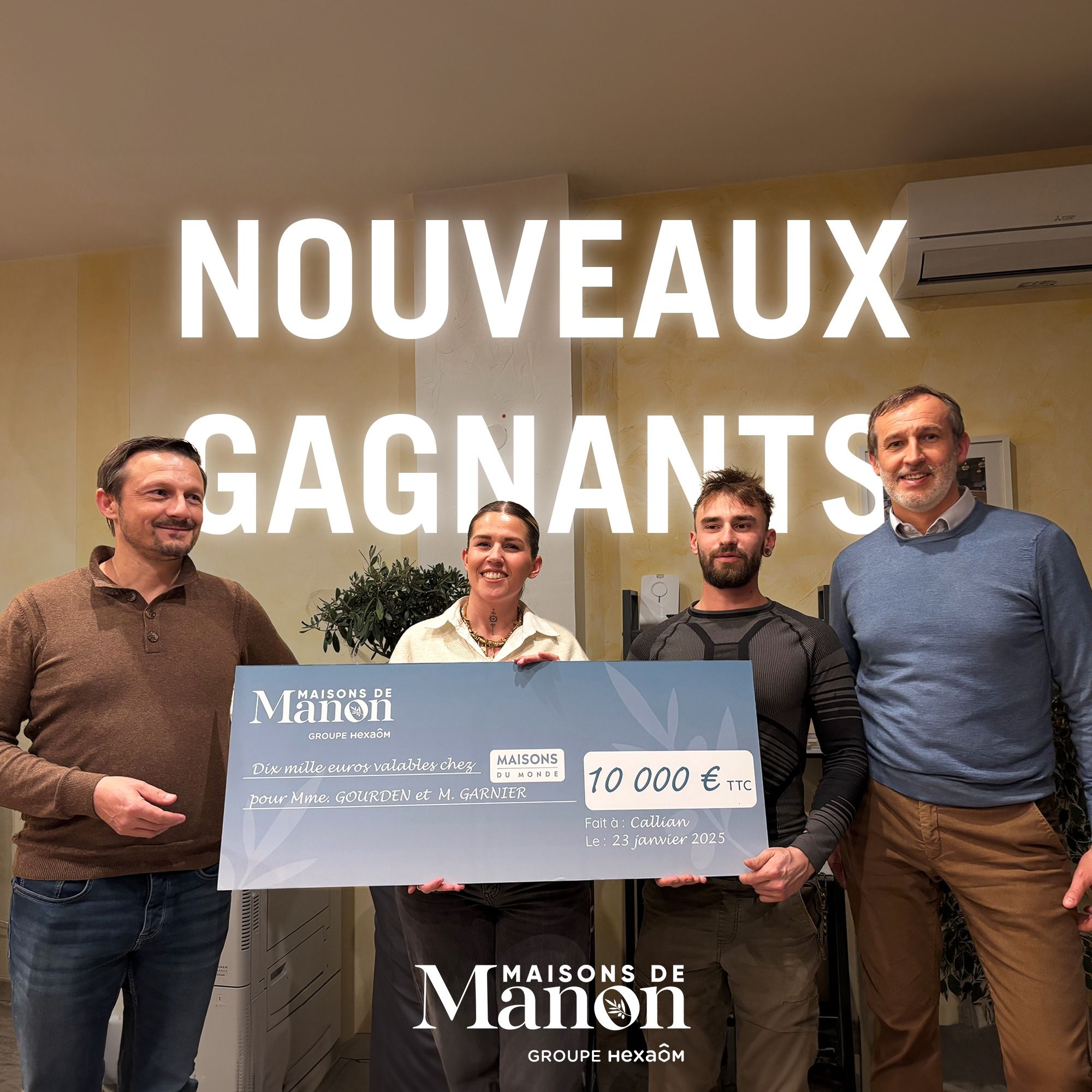 Ce jeu concours, qui a eu lieu en 2 vagues, a permis de faire gagner à 2 de nos clients un bon d’achat d’une valeur de 10 000€, à valoir chez notre partenaire. L’opération consistait en un tirage au sort parmi les clients qui avaient signé avec Maisons de Manon sur les périodes de septembre – octobre 2024, pour la 1ère vague du jeu concours, et novembre – décembre 2024, pour la 2ème vague du jeu concours.